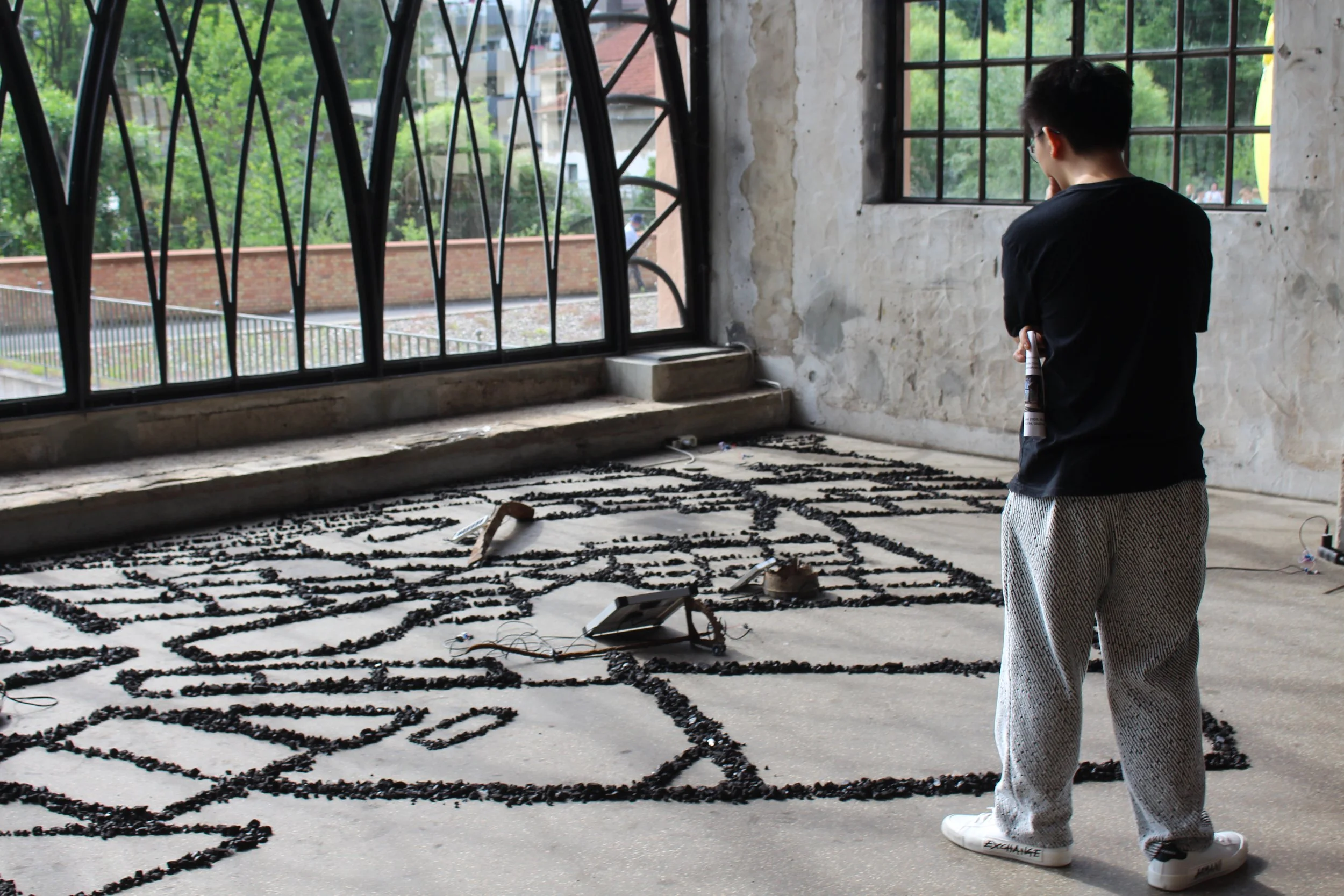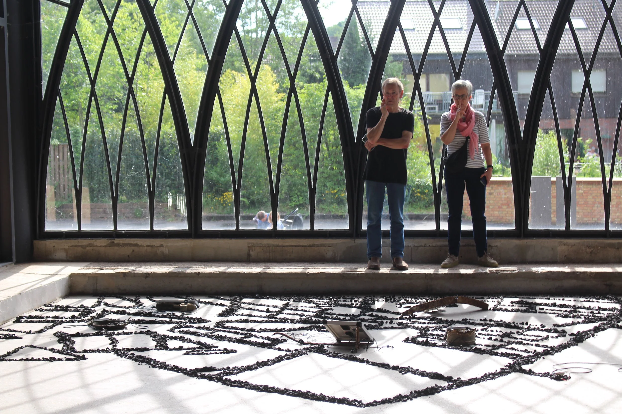 Hin und Wieder (Once in a while) follows the path of sunlight through the front windows of the Sayner Hütte, a former metallurgical plant in Bendorf, Germany. Coal records the shadow movements, and a solar-powered sound piece is played when the solar panels are exposed to sunlight. The sound composition is based on fragments of the Lux Aeterna chant from the Graduale Romanum (1974, p. 676, Liturgia defunctorum). The chant reflects the building’s east–west orientation and its Gothic-inspired structure—industrial, yet shaped like a church. The work connects light, sound, and material to explore the rhythm of the day and the memory of the site. It examines how past and present, nature and architecture, continue to shape one another.
